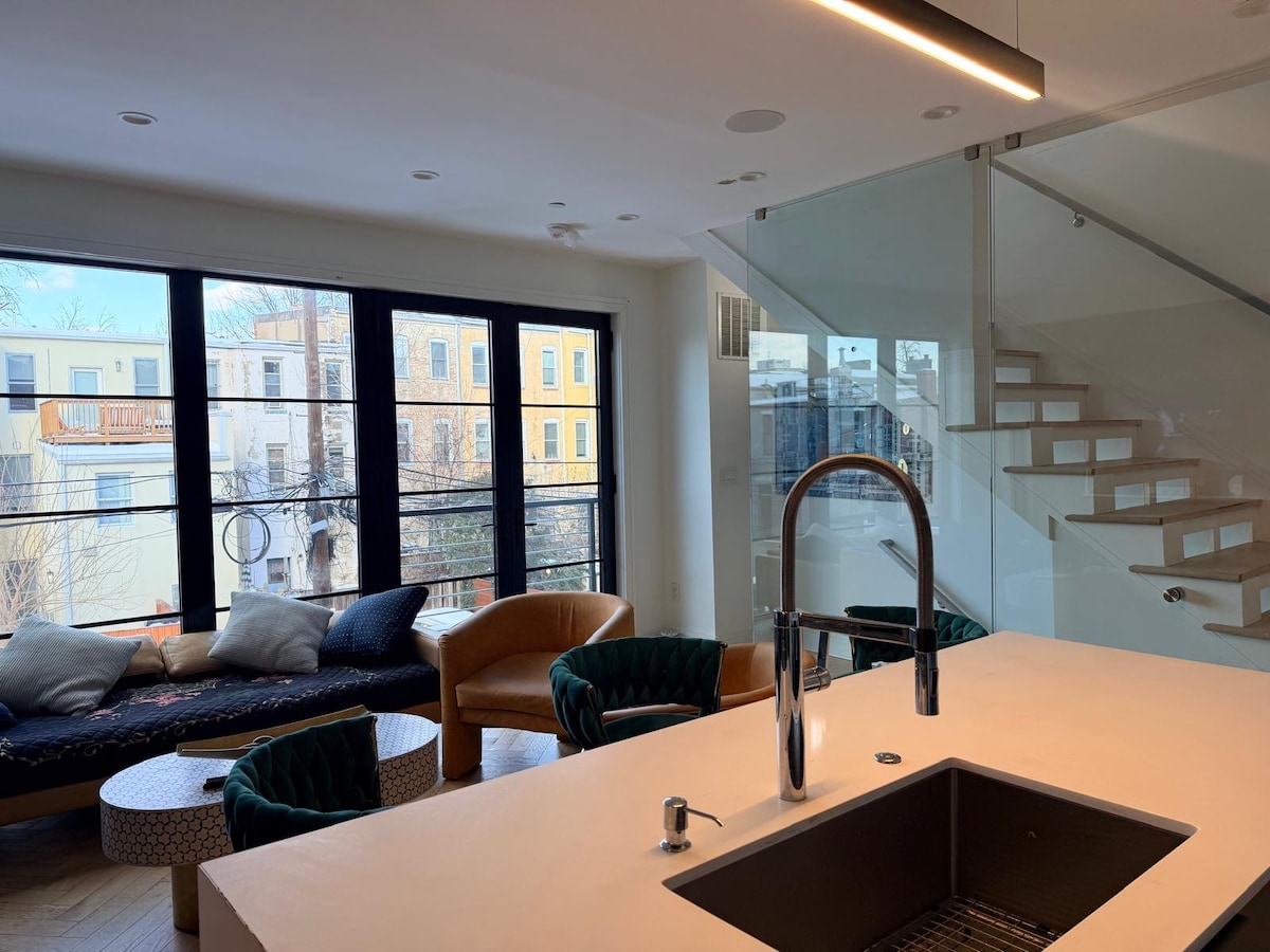 Spacious NW DC townhome with 3 queen bedrooms sleeping up to 6 guests. Features 2 full bathrooms + 1 half bath, an open-concept kitchen, separate office room, and a comfortable living room with reclining sofa.