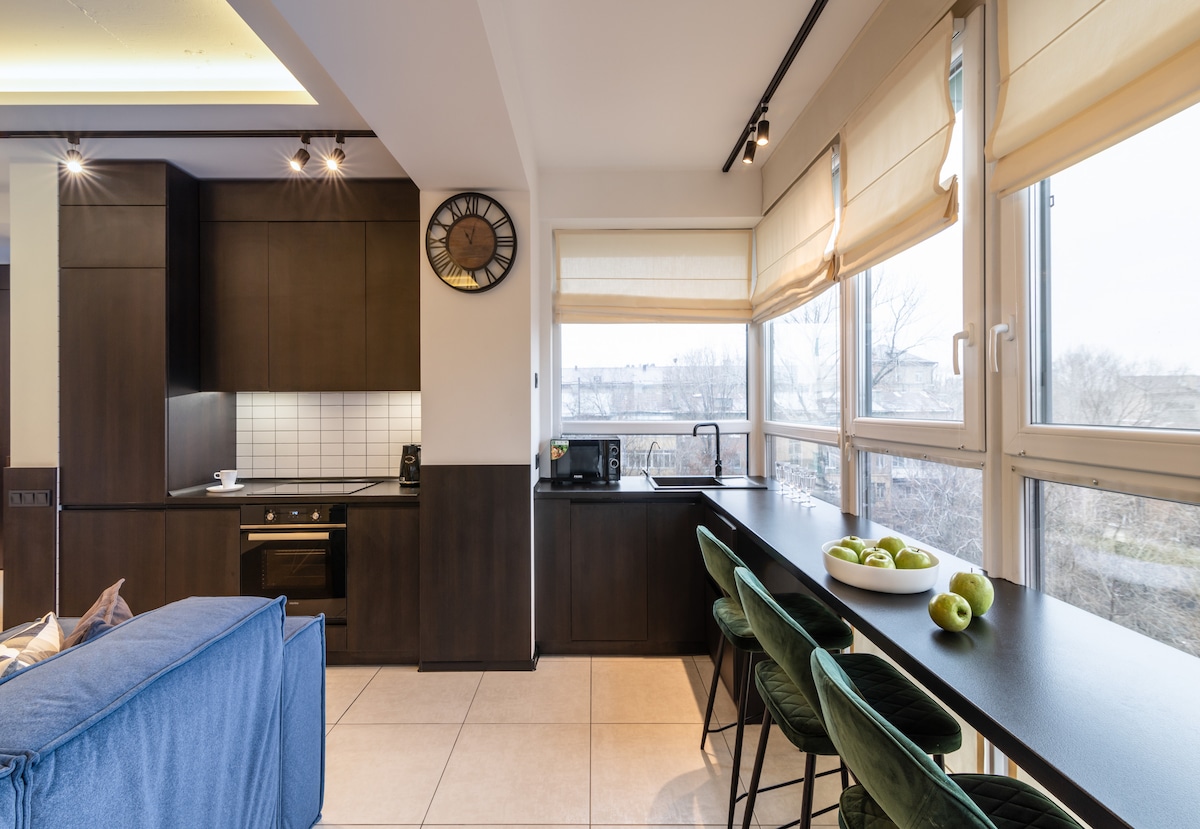 Green studio apartment is situated in the heart of Dnipro city The apartment is on the last 9th floor and the size is about 35 m2 The ceiling height is more than 3 meters, that is why the apartment looks spacious. Soft comfortable bed, fully equipped kitchen including a washing machine and microwave. The brand new and latest QLED model of Samsung smart tv. The bathroom has a shower and separate toilet room.