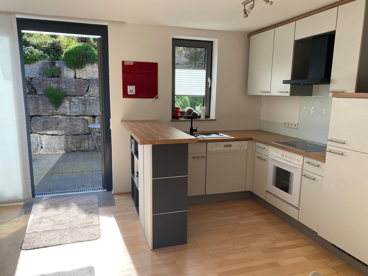 Kleines 1,5 Zimmer Apartment mit eigenem Eingang, geschmackvoll eingerichtet für 2 Personen mit einer Aussenterrasse & kl. Garten. Wohnbereich mit einem schönen Ledersofa, TV & Internetradio. Kochnische mit Kühlschrank, Ceranplatte & Microwelle/Backofen. Abgetrennter Schlafbereich mit 160cm Boxspringbett und kl. Kleiderschrank. Schönes modernes Badezimmer mit Dusche. Parkmöglichkeit direkt vor der Haustür