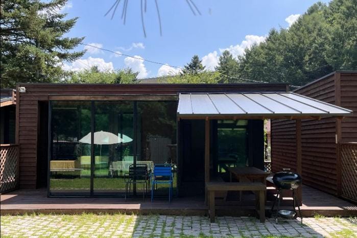 客室からは、洪川と山の景色が広がる天然芝生の庭園 緑あふれる癒しの場所です 緑あふれる広々とした屋外テラスバーベキュー& 寒い季節には、客室につながる屋内バーベキューエリアをご利用いただけます 家族や友人と快適に過ごせる空間です。
