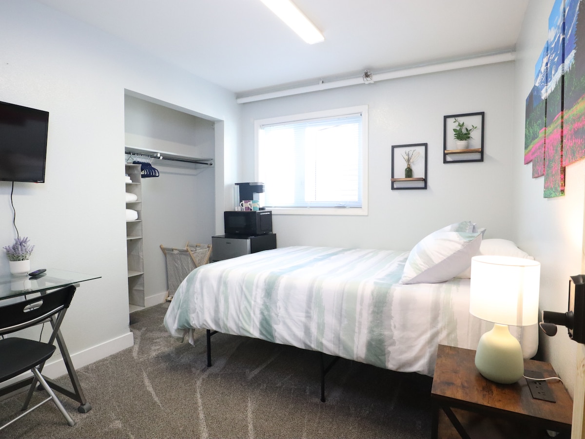 この個室は、20室のホステルの最上階にあり、快適なクイーンサイズのベッド、スマートテレビ付きのワークデスク、冷蔵庫、電子レンジ、コーヒーステーションが含まれています。空港とダウンタウンから10分で、ミッドタウンビューが楽しめ、徒歩圏内にレストランやショッピングがあります。 ゲストの皆様に、この穏やかで居心地の良いお部屋を提供できることを嬉しく思います。