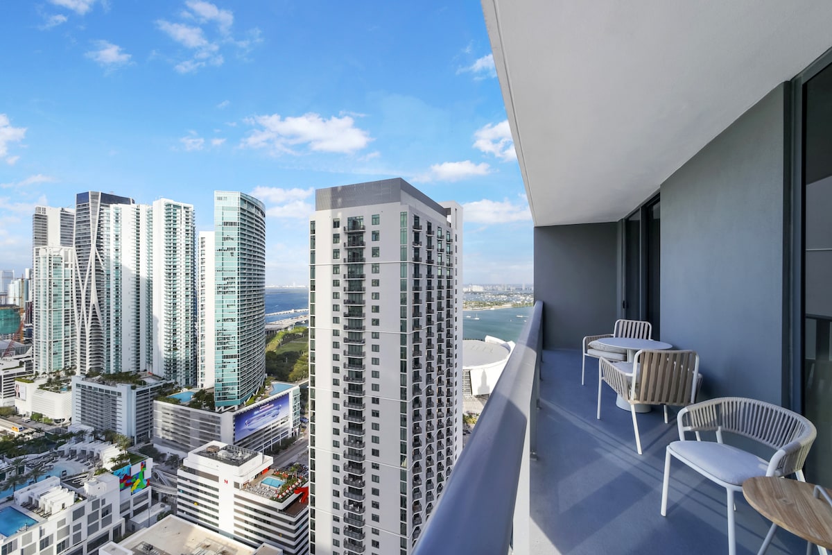 50階でモダンな贅沢を体験しましょう! 新しく設計された1ベッドルームのペントハウスは、床から天井までの窓から息をのむような湾と街の景色を眺めることができ、自然光で空間を満たしています。寝室にはキングサイズのベッドがあり、リビングには快適なソファベッドがあり、最大4名様まで宿泊可能です。設備の整ったキッチン、リゾートスタイルのプール、ジム、スパをお楽しみください。 マイアミのダウンタウンに位置し、市内最高のダイニング、ショッピング、ナイトライフからわずか数歩です。