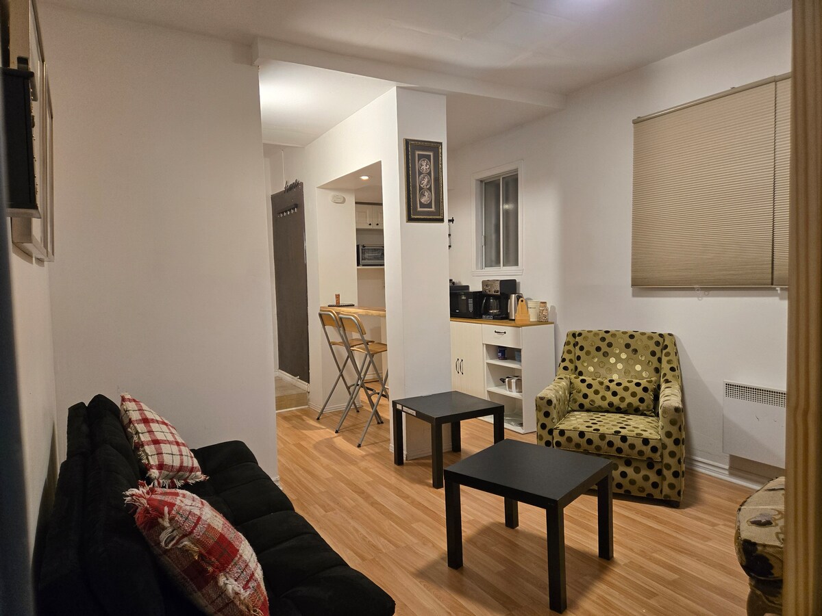 Charmant studio situé dans un environnement calme et champêtre, près de toutes les facilités et pouvant confortablement accueillir 2 adultes. - Entrée partagée - Jolie terrasse - Accès à la piscine extérieure chauffée (mai à octobre) - Cuisine fonctionnelle et complètement équipée - Salle de bain avec douche et laveuse-sécheuse - Chambre à coucher confortable. Lit Queen - Station de Métro à 100 mètres - Plusieurs commerces à quelques minutes de marche