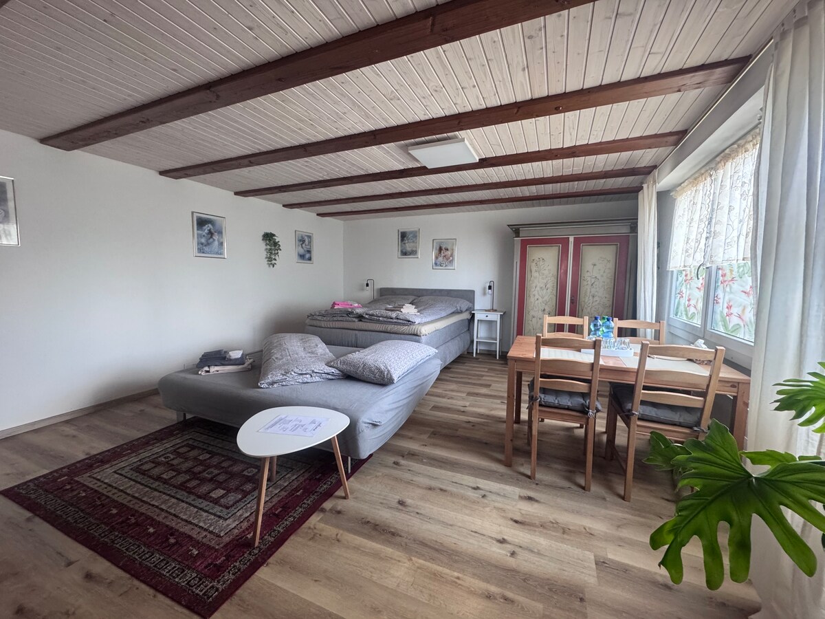 屋根裏にある快適なアパートで、独立した玄関と階段、清潔なバスルーム、小さなキッチン、ボーデン湖とスイスアルプスを見下ろすバルコニーがあります。バルコニーで朝のお茶やコーヒーを楽しみ、まるでリトリートにいるような気分になります。設備の整った共用キッチンを無料でご利用いただけます。家の前に専用駐車場があり、キャラバンやキャンピングカー用のスペースもあります。部屋は週単位で貸し出しています。