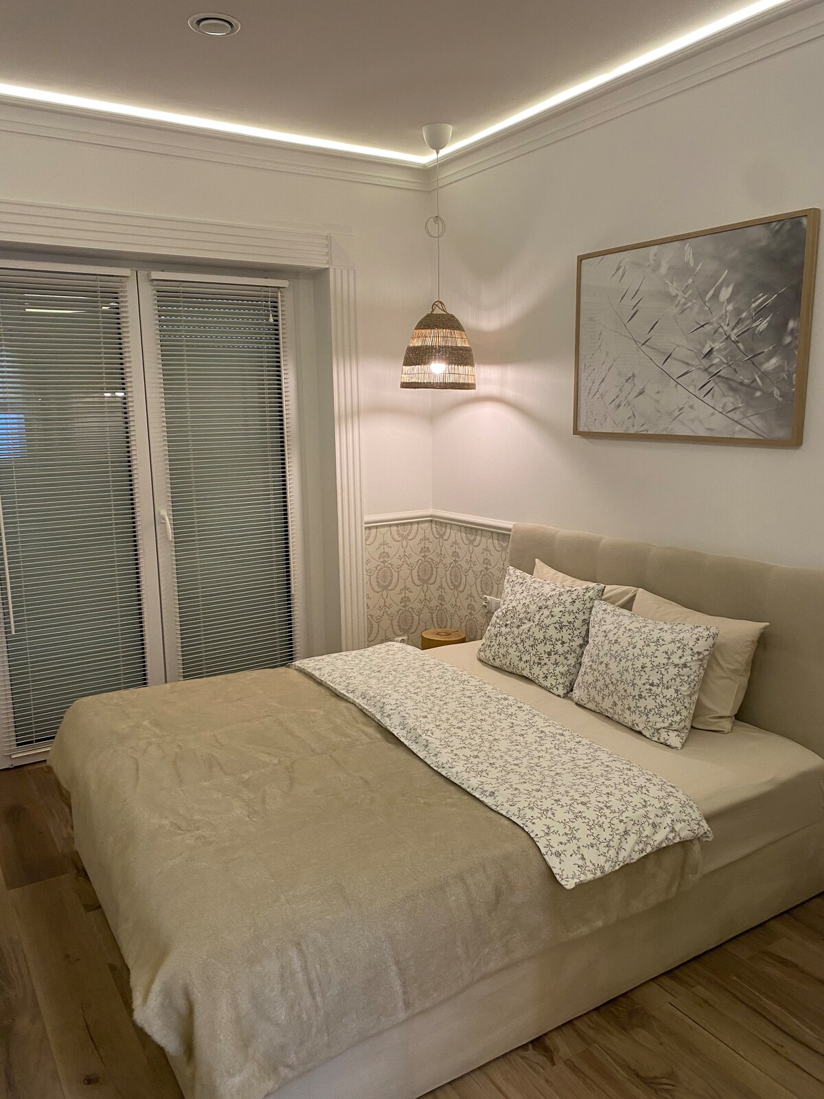 Apartament mieści się w budynku wolnostojącym nad jeziorem, na pierwszym piętrze, wyposażonym w windę. Każde pomieszczenie zostało urządzone z dbałością o szczegóły. Do Państwa dyspozycji oddajemy jedną sypialnię z podwójnym łóżkiem i światłowodowym gwieździstym niebem na suficie. Pokój dzienny z dużym rozkładanym narożnikiem i aneksem kuchennym oraz przytulną łazienką.W każdym pokoju znajduje się telewizor z dostępem do internetu i darmowym WiFi. Kuchnia jest w pełni wyposażona i urządzona.