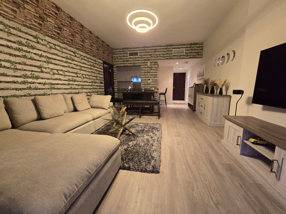 Stay in style at this elegant 1BR apartment in Dubai. Designed in soft beige tones with gold accents, it offers hotel-style comfort and a calm atmosphere. Enjoy a cozy living area with Smart 65 inch TV, a fully equipped kitchen, and a private balcony for your morning coffee. Close to Global Village, IMG Worlds, and Downtown Dubai, it’s perfect for couples, professionals, or anyone seeking a relaxing Dubai stay.