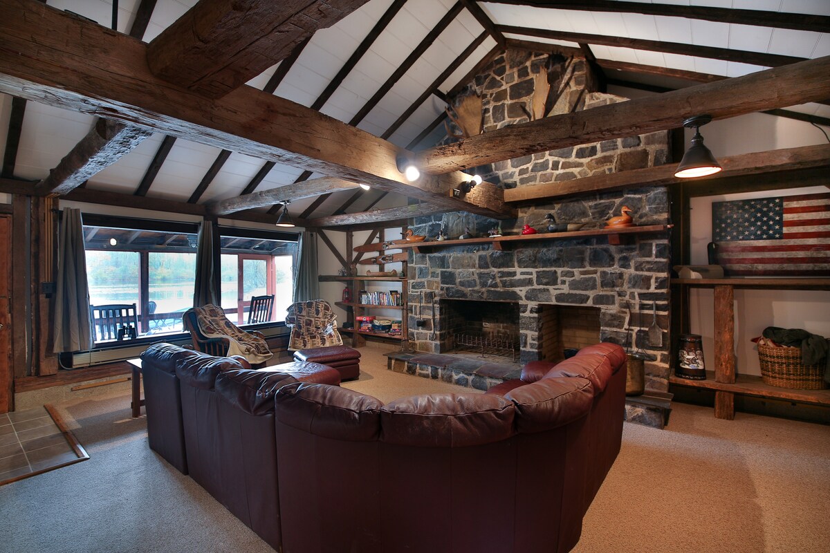 この快適なキャビンは、アッパーバックス郡のとても田舎の地域にある11エーカーの敷地内にあります。6エーカーの池のすぐ端に位置し、景色は最高です。ボートとライフジャケットをご用意しています。石の多い浜辺で焚き火を囲んで座ったり、芝生のエリアで焚き火を楽しんだり、ホースシューズをしたり、バーベキューをしたり、浜辺で子供たちが釣りをするのを見たりできます。 広くて静かなスクリーン付きのポーチにあるロッキングチェアに座るか、中に入って床から天井までの石の暖炉のそばに座りましょう。 州の狩猟場まで2マイル未満です。
