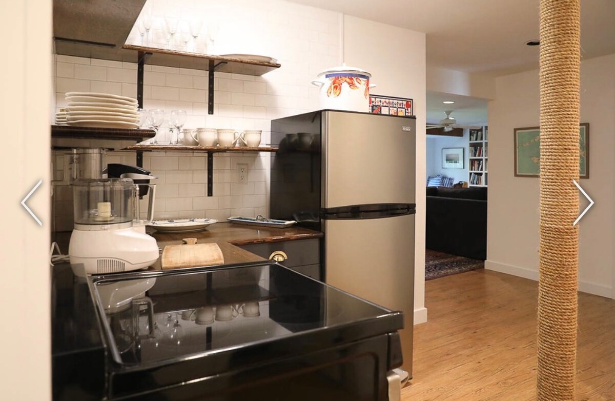 A fully-furnished one-bedroom guest apartment (600sq ft) on two levels attached to our house. Separate entrance. Ensuite-shower and complete kitchen. 3 miles from downtown Edgartown, 5 miles to State Beach. In a peaceful neighborhood abutting miles of state forest trails. WiFi, workspace, laundry, smart TV and air conditioning. It can be difficult to secure a ferry res for your car when planning last minute trips in summer. May we suggest renting a bicycle or use a taxi/ride-share service.