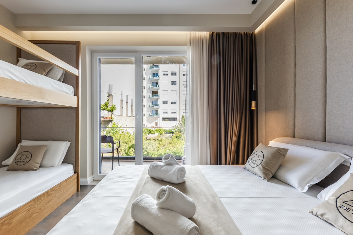 2025年6月にオープンした真新しいモダンなホテル、Zoe's Villaの広々とした客室へようこそ。最大4名様まで宿泊可能で、ダブルベッドと二段ベッドを備え、家族連れや少人数のグループに最適です。ビーチ、ショップ、レストランからすぐ近くにあります。無料駐車場、リラックスできる共用エリア、オプションの朝食をお得な料金でお楽しみください。ドゥラスの中心部で快適さと利便性を体験してください。