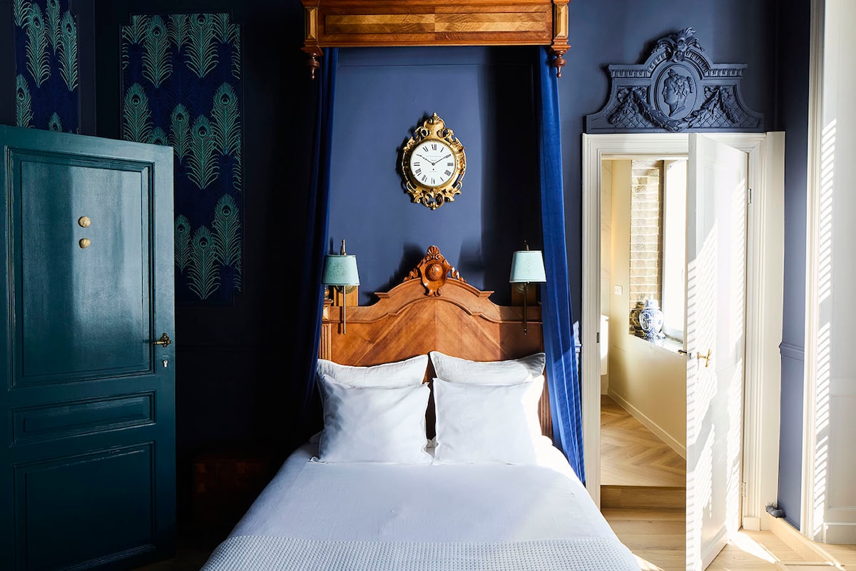 お風呂付きのエレガントな客室、深い青色の雰囲気