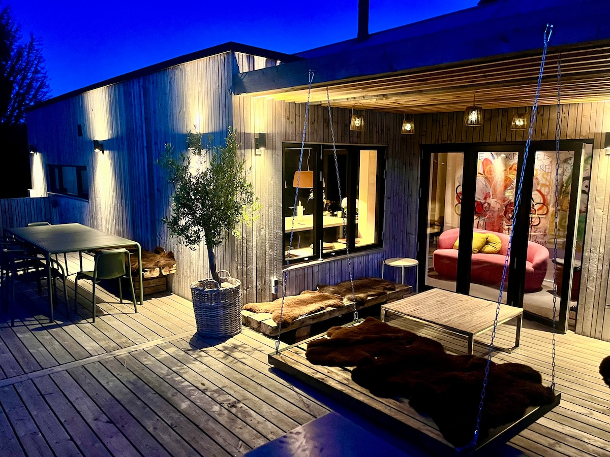 このユニークな宿泊施設には、独自の北欧スタイルがあります。内外のあらゆる場所が、団らんを念頭に置いて装飾されており、すべての部屋で時間を過ごしたいという気持ちを起こさせます。2つのロフトでは青空を眺めながら目覚め、家の大きなキッチン・ダイニングルームでは、6メートルの長さの天窓が部屋全体に素晴らしい光を放っています。広々とした空間と居心地の良いコーナーがたくさんあり、大家族が集まって、日々の喧騒から解放されて休息を楽しむことができます。