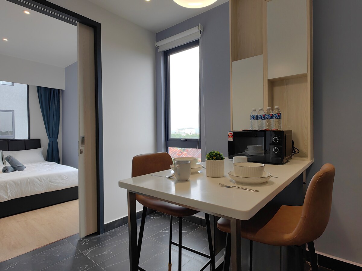 新しいワンルームで清潔で快適な滞在をお楽しみください!温水シャワー、爽やかなプール、ジムでリラックスしましょう。 快適にご利用いただくために、滞在ごとにすべてのベッドシーツと枕カバーを洗濯しています。 イオンショッピングモールまで徒歩わずか5分で、下にはたくさんのレストラン、バー、ショップがあります。 車で行ける場所: *ティンバーランド病院まで5分 *サラワク総合病院まで6分 *ボルネオメディカルセンターまで8分 *ボルネオ文化博物館まで10分 *The Springショッピングモールまで10分 ビバシティまで12分 *ウォーターフロントクチンまで10分