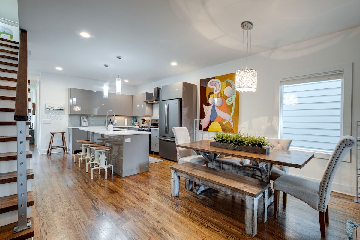 街のスカイラインを一望できる屋上デッキを備えた、大きくてゴージャスなモダンな家。おしゃれなイーストナッシュビル地区にあります!ダウンタウンのブロードウェイバーからわずか3マイル、空港からは約15分です。屋外席とガスグリル。庭は完全にフェンスで囲まれています。近くにはたくさんのレストラン、ショッピング、カフェ、バー、ライブハウスがあります。洗濯機・乾燥機、敷地内無料駐車場、リビングルームと寝室のスマートテレビ、家の中の高速Wi-Fi。メモリーフォームマットレス。グループに十分なスペースがあります!