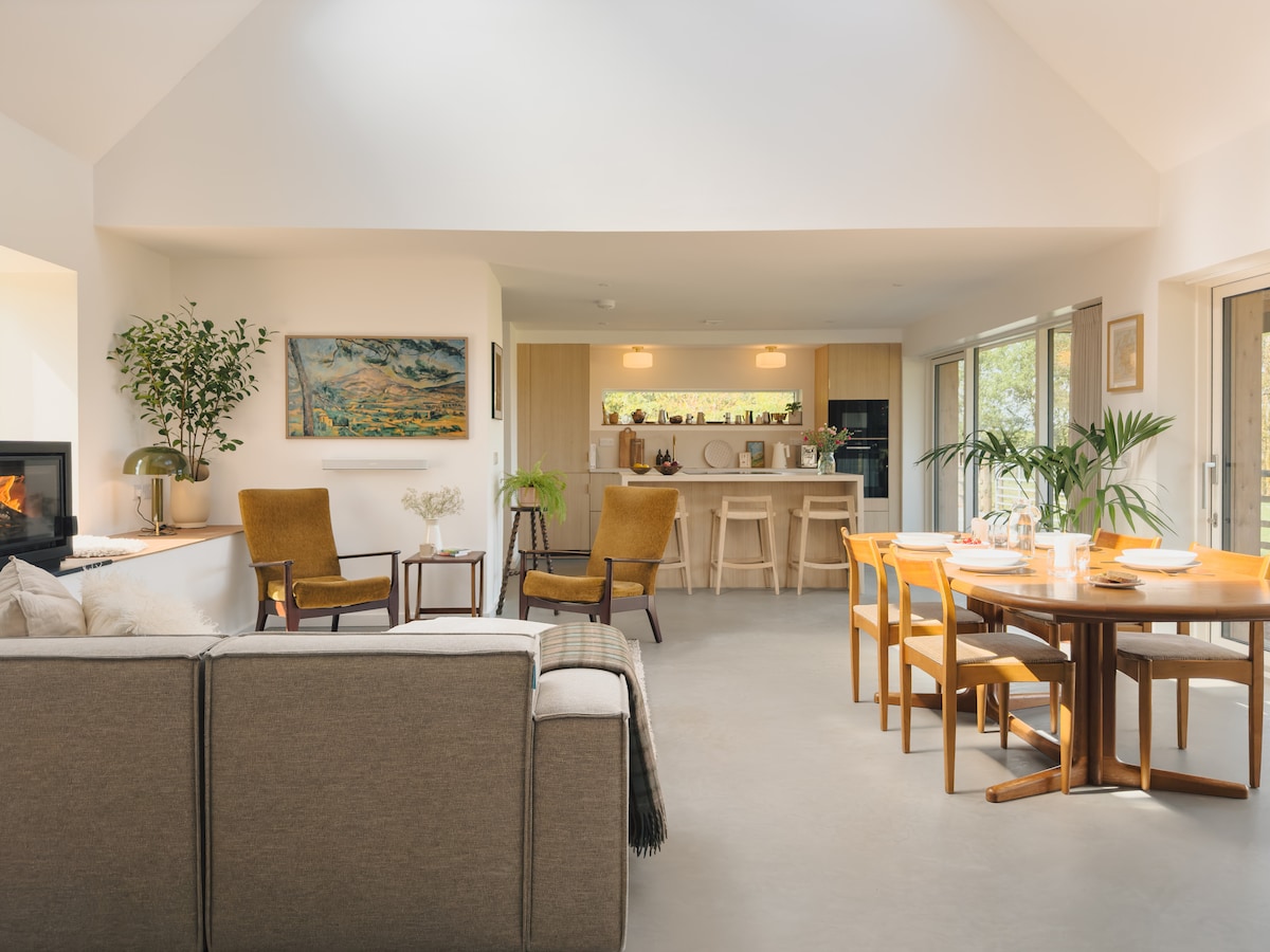 A peaceful countryside escape just outside Glasgow, designed for slow living and deep rest. Thoughtful interiors meet open skies, creating a quiet kind of luxury that invites you to do nothing at all. Light the fire, pour a glass of wine, and watch the trees sway outside.