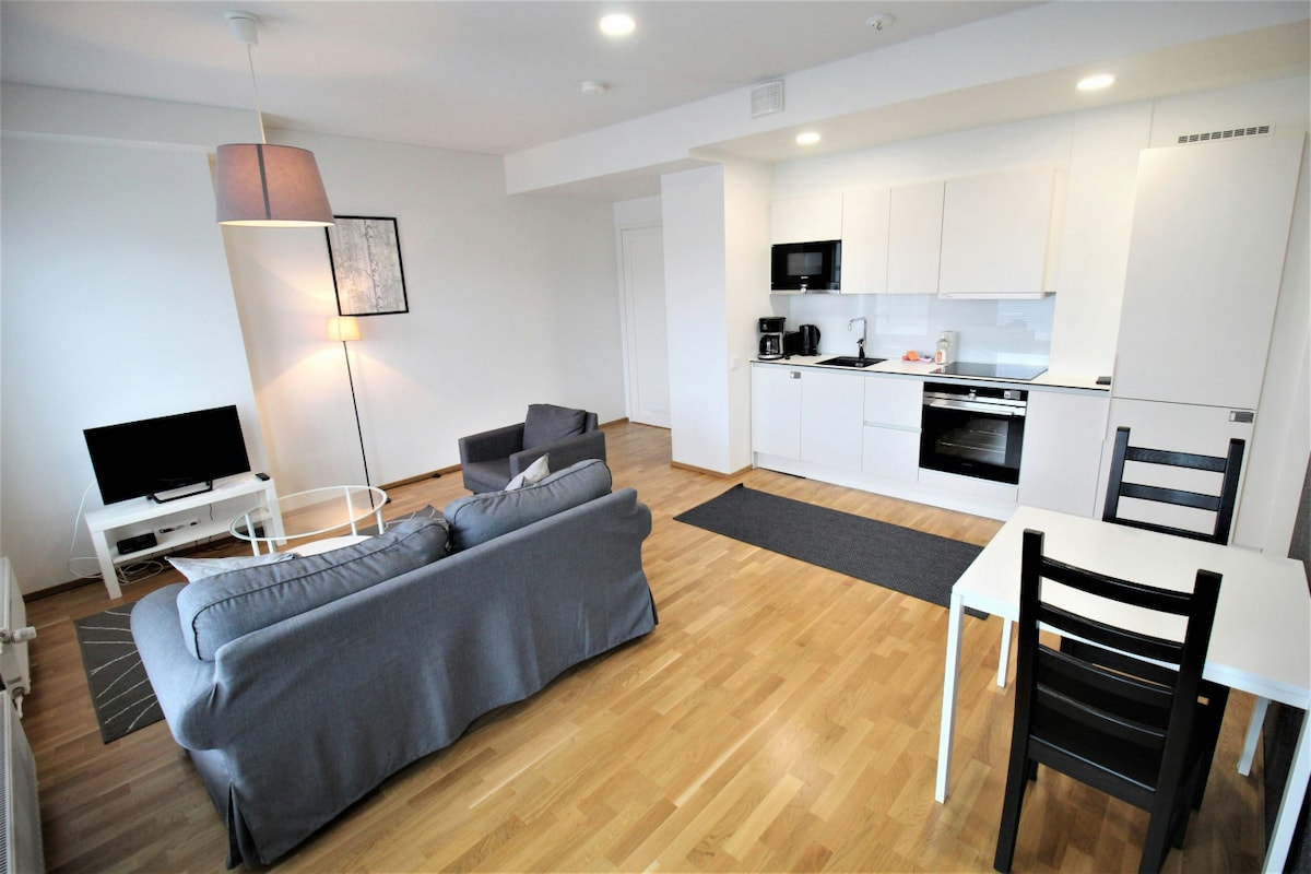 Welcome to a beautiful two-bedroom apartment located a few kilometers from the city center in a quiet area. Enjoy nearby nature and jogging paths, a swimming beach, and convenient access to the city center via a bus stop next door. The apartment includes all essentials for smooth living, such as dishes, cooking utensils, bed linen, towels, a washing machine, and a private sauna. Additional services like periodic cleaning are available.