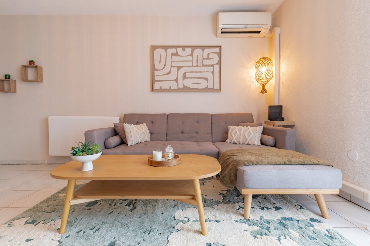 この30平方メートルのワンルームでゆっくりお休みください。1〜4名様に最適で、インダストリアルスタイルでエレガントです。オフィススペース、設備の整ったキッチン、バスルーム、リビングルームがあります。 広いテラスでは、緑豊かな静かな空間でリラックスできます 🕊️ ミュレ市の中心部の商店街の近くで、土曜日の朝の市場まで徒歩10分です。 トゥールーズの市内中心部から車で25分です。 シーツ、タオル、キッチンタオル、コーヒー、駐車場: 含まれています ✅
