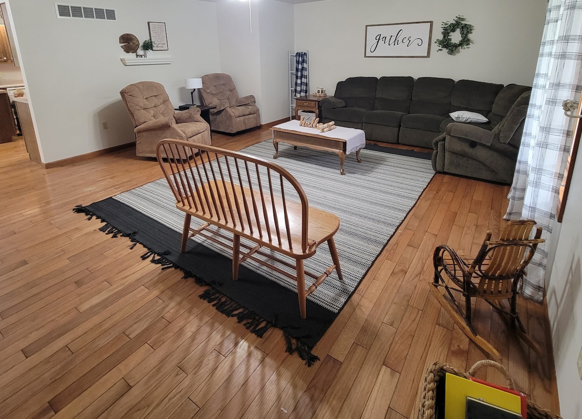 Take a break and unwind at this peaceful oasis. This is a guest house on our little farm in the country. Our house is right next door but we will give you all the privacy you want. Your stay will include homemade baked goods made by our family, Cold breakfast foods such as cereal and fruit will be available. There is a beautiful pine grove with a picnic area and a fire pit for your use. There is also a massage chair by the electric fireplace where you can relax those aching muscles.