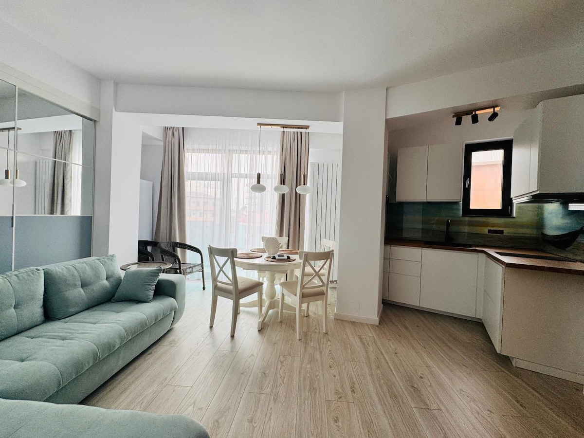 Bright and newly renovated studio, perfect for a relaxing holiday in Eforie Nord. Located near Techirghiol Lake and just a 15-minute walk from Belona Beach, it offers a modern private bathroom, fully equipped kitchenette (electric hob, fridge, coffee machine) and a washing machine. Ideal choice for couples or families, close to restaurants, shops, and main attractions.