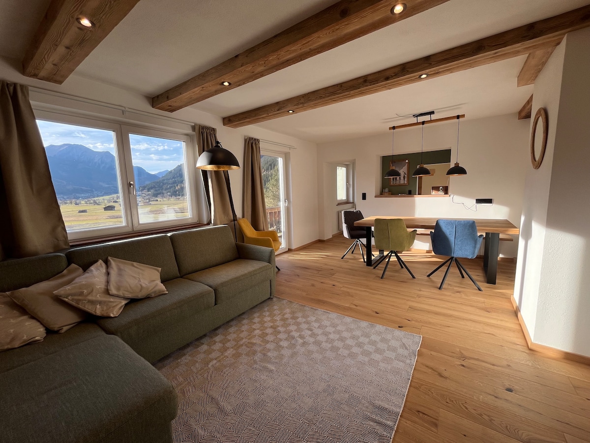 これは私たちの大きな1階のアパートです。かつての村の店から改装されたこのアパートは、部屋の高さが3メートル以上で、広い中央のリビングルームだけでなく、ラウンジと4つのベッドルームにも十分なスペースがあります。全ての側面に光があり、2つのモダンなバスルーム、ツークシュピッツェを望む小川のすぐそばのテラス、庭、素敵な古いディテールと新しいディテール-何が欲しいですか? そして今、村の広場も新しく改装されました。