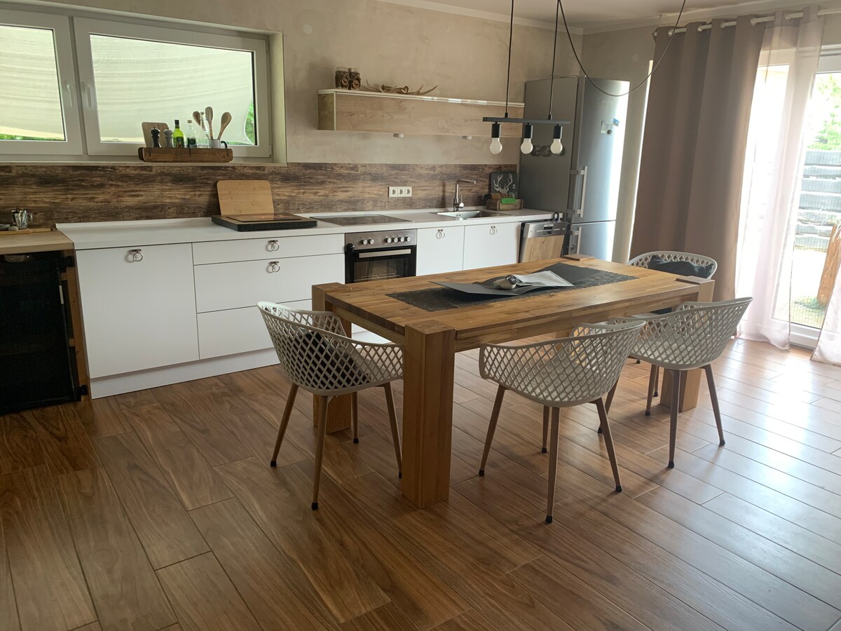 This comfortable 108m² ground-floor apartment (barrier-free) boasts a charming village-like location on the outskirts of town,with easy access to the baroque city of Fulda and the nearby Rhön region. In addition to two bedrooms and a children's room,the apartment features two bathrooms.The spacious living room,equipped with a 55-inch smart TV,open-plan dining area and fully equipped kitchen,is sure to impress.The cozy ambiance of a wood-burning stove and a bathtub invite you to relax and unwind.