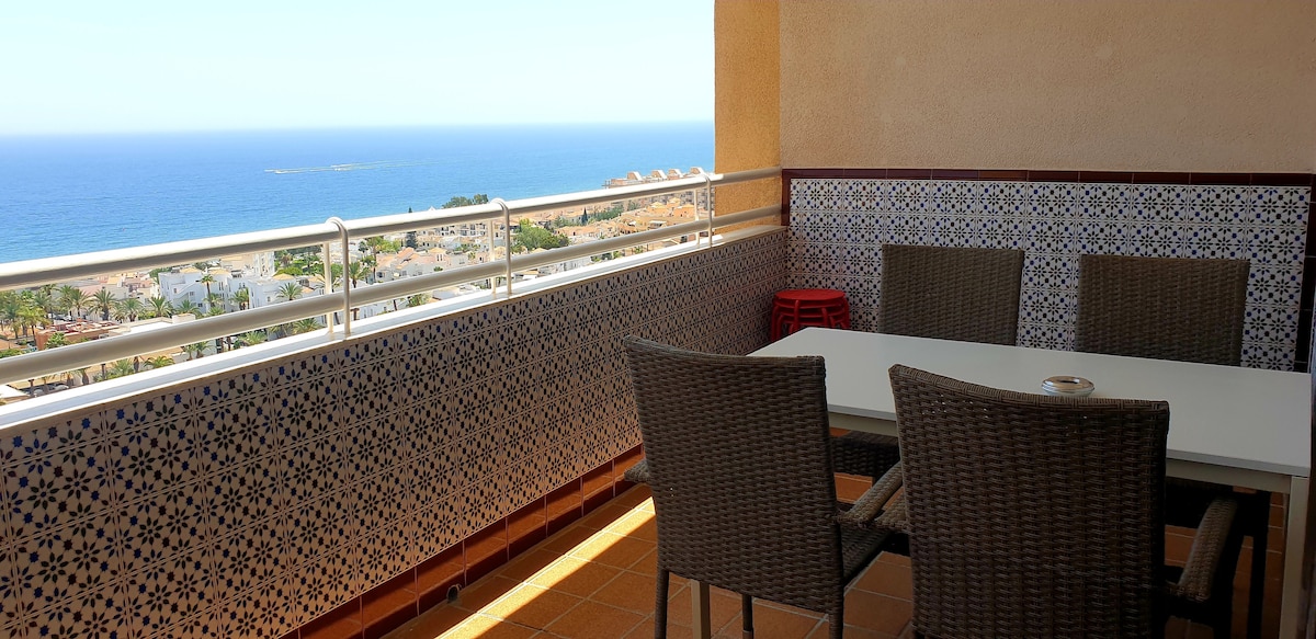 (VFT/AL/092956) Soleado apartamento reformado con impresionantes vistas al mar (Planta 14, orientación sur). Situado en una zona tranquila, segura y estratégica de Aguadulce Sur, a un paseo de la playa y del resto de servicios (supermercado Consum, bares, restaurantes, tiendas, bus, gimnasio...). Cocina equipada (Vitrocerámica, microondas, cafetera de cápsulas, tostador, exprimidor). SmartTV, Wifi, aire condicionado/bomba de calor, ventiladores de techo y lavadora.