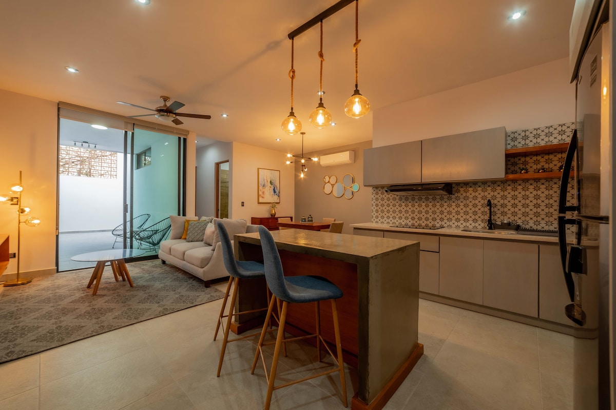 ✨海から1ブロックのジャグジー付き屋上 屋上のプライベートジャグジーから素晴らしい夕日をお楽しみください。このモダンなコンドミニアムは、ロマンチックな休暇やリラックスした休息に最適です。静かなエリアにあり、海からは1ブロック、ヤシの木と潮風に囲まれています。 🛏 快適な客室1室 🛁 2つのフルバスルーム 👙ジャグジー付きの専用屋上 ☕設備の整ったキッチンとエアコン 🌐Wi-Fiと駐車場付き リラックスして、くつろぎましょう!
