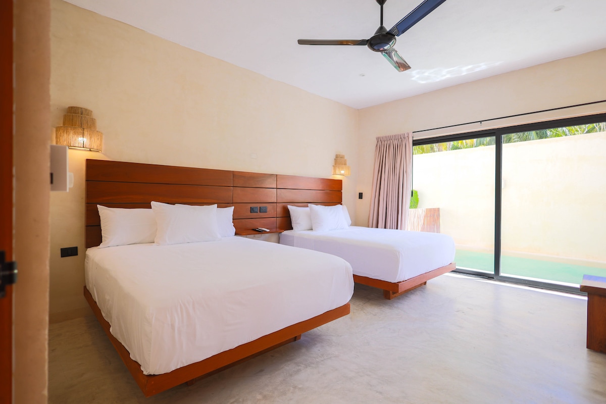 Chak Room is a comfortable and inviting space located on the second floor of the hotel. It features a king-size bed, a fully equipped kitchen, TV, Starlink high-speed Wi-Fi, and toiletries for a carefree stay. Enjoy your private balcony for fresh air and quiet moments. Guests also have access to the rooftop, where you can swim in the pool, relax in the sitting areas, and watch beautiful sunsets over El Cuyo. A calm retreat made for unwinding.