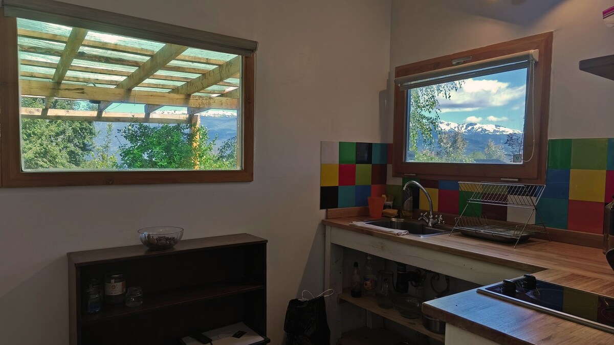 Anclada sobre el cordón rocoso de la cordillera del Piltriquitrón, con un deck de madera con unas vistas de ensueño , construida bajo los fundamentos de la permacultura; fardos de pasto y techo vivo, termotanque solar, para optimizar los rayos y el calor del sol, ofrece a sus visitantes una vista única del Valle del Hoyo, permitiéndote estar en contacto con animales, disfrutar de alimentos orgánicos; en resumen un espacio mágico en el que encontrarás donde vivir un encuentro real contigo mismo.