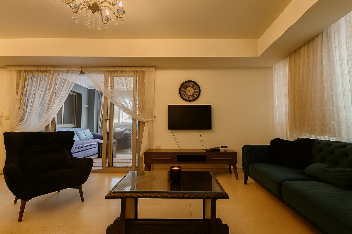 Experience a modern designer stay in Uptown Cairo. This curated apartment offers two cozy bedrooms, a bright living area, a fully equipped kitchen, and thoughtful details throughout. Enjoy access to a secure gated community with landscaped paths and a heated pool. A calm, elegant space perfect for relaxing, working, or exploring Cairo with comfort and ease.