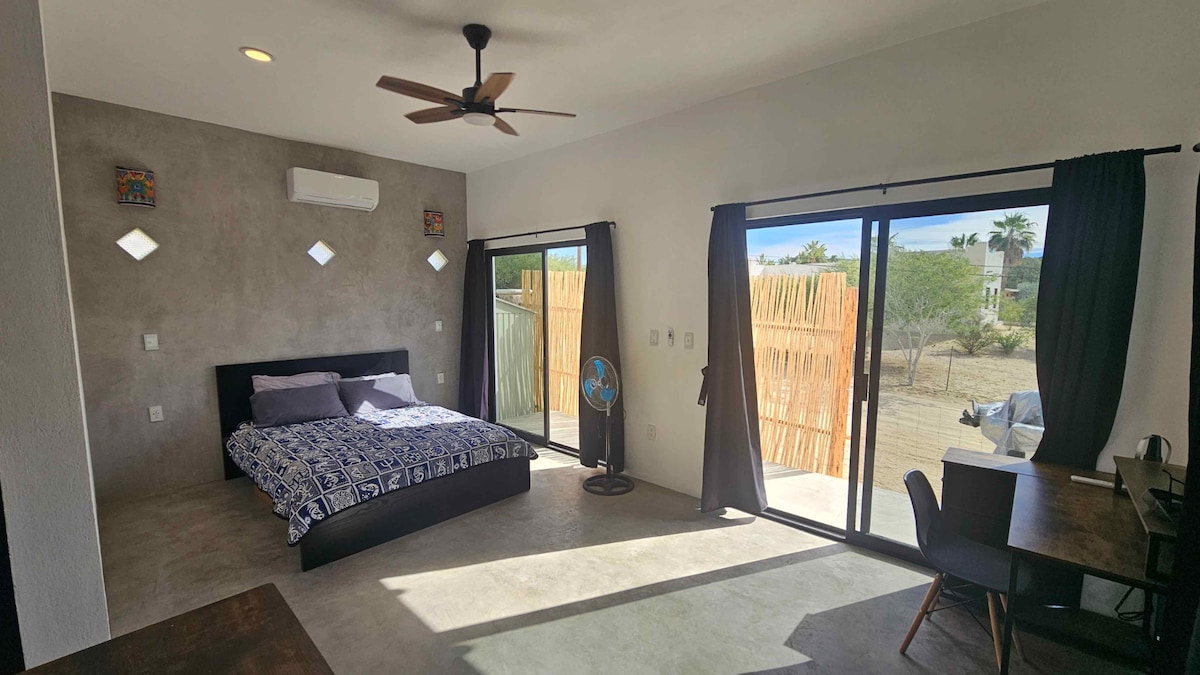 ビーチとラ・ベンタナ砂漠を楽しむカップルに最適な、静かで中心部にあるこのシンプルな宿泊施設をお楽しみください。ビーチ(中央ビーチ)から徒歩3分、幹線道路から3ブロックです。美しい日の出をお楽しみいただけます。ベッドルーム、Netflix、YouTube付きテレビ、小さなクローゼット、バスルーム、基本的な調理器具を備えた小さなキッチン、読書や仕事をするための快適な椅子、Wi-Fi、お湯、エアコンが備わっています。