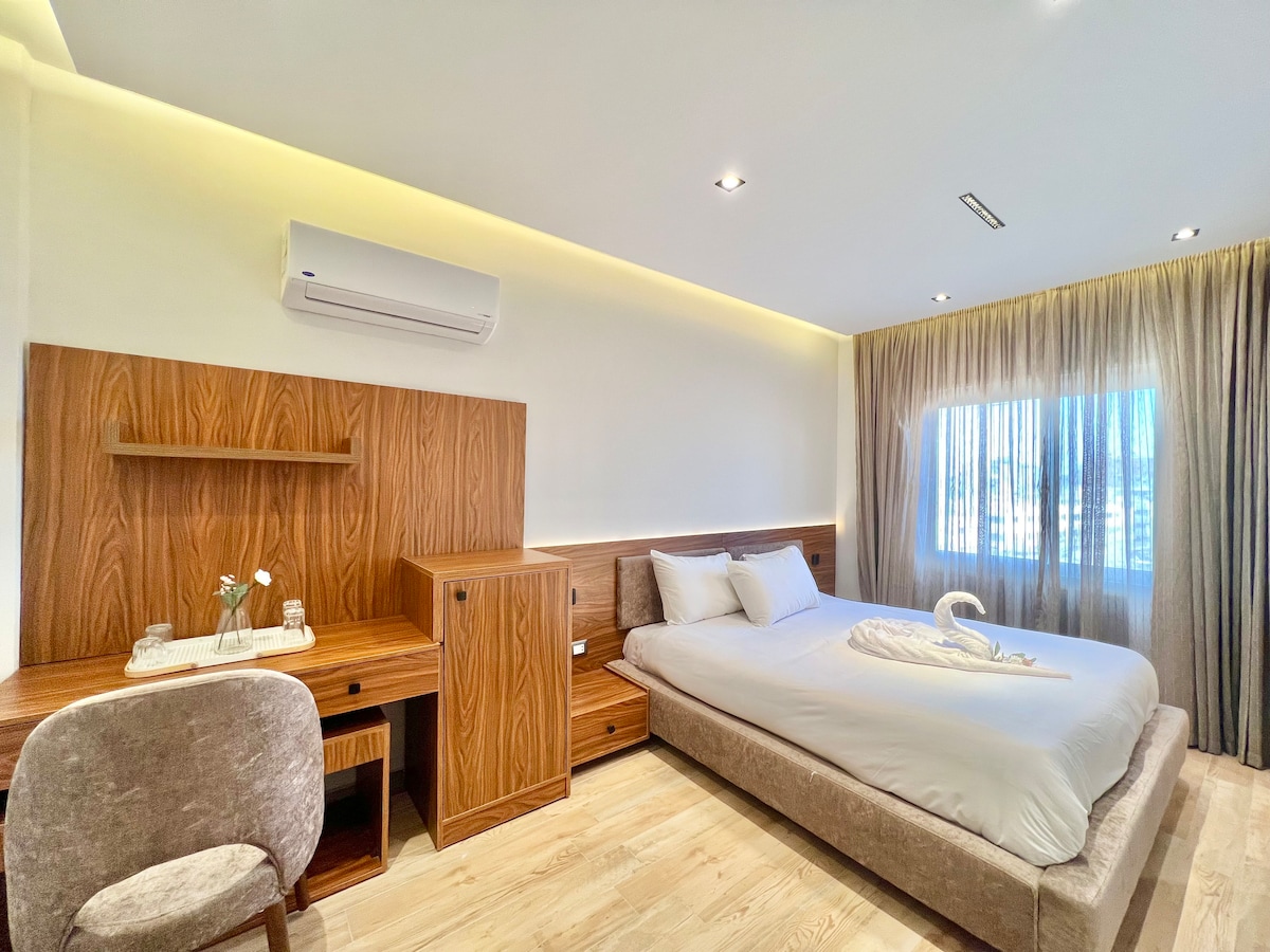 お部屋は2階にあり、新しく改装されたお部屋の1つです。 ゲストは美しくデザインされたエジプトをテーマにしたお部屋での滞在をお楽しみいただけます。 ダブルベッド1台、クイーンベッド1台、屋上からのピラミッドビュー!無料の飲料水をご用意したコーヒー/紅茶ステーションがあります。 こちらは家族経営のビジネスです。ここにいるときは、みなさんも家族の一員です。 ご不明な点がございましたら、お気軽にお問い合わせください。 お部屋ごとに専用バスルームがあります。