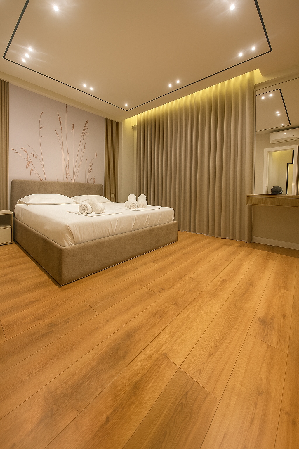 100 m² designer 3-bedroom in Tirana’s prime center, steps from Skanderbeg Square and the New Bazaar. Walls dressed in refined wallpapers, two stylish bathrooms, and hotel-quality beds with custom mattresses for deep sleep. Enjoy two balconies for morning coffee or sunset drinks. Fully equipped kitchen, fast Wi-Fi and A/C throughout. Ideal for families, friends or business stays seeking space, comfort and quiet elegance.