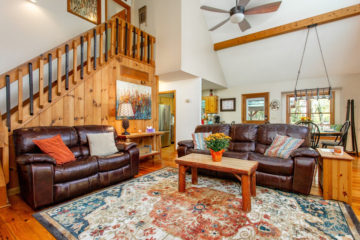 サンセットリッジのログハウスで山の旅をお楽しみください! この居心地の良い2ベッドルーム1バスルームのキャビンでは、木々の上にいるのが自宅にいるかのように感じられます。 この場所は、山の尾根の素晴らしい夕日を眺めることができます。 700平方フィート以上の屋外リビングスペースとユニークな屋外暖炉があり、星空の下で4人用のホットタブに浸ったり、夕日を浴びたりすると、頻繁に鹿や七面鳥が見られます。 キャビンはペット2匹までペット料金で連れてこられます!