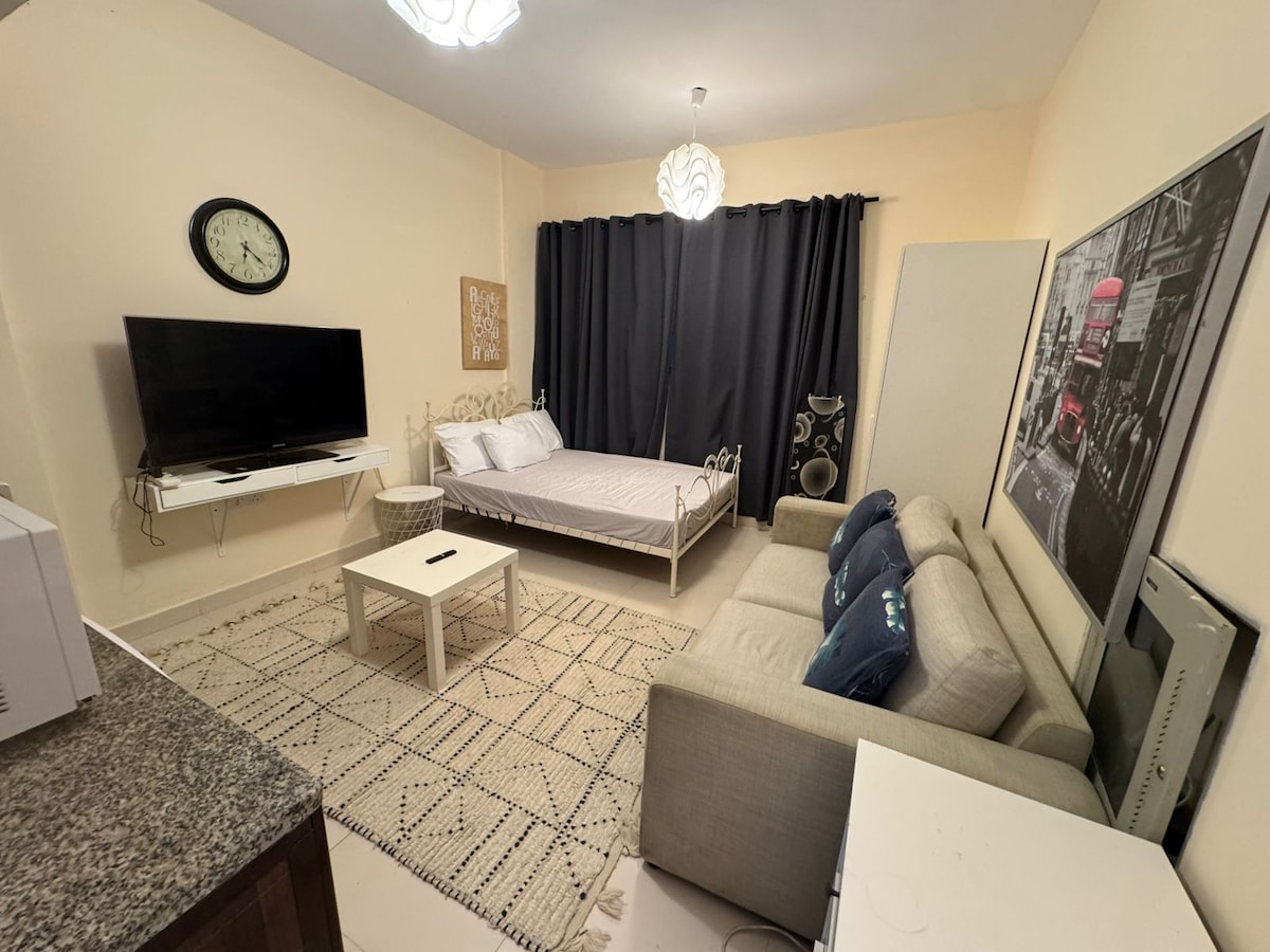its a moders studio based in ajman alalia near the main road easy access its about 35 min to dubai airport, 25 min to sharja airport , good location have a seperate kitchen , seperate bathroom and a big king size bed with sofa and Tv
