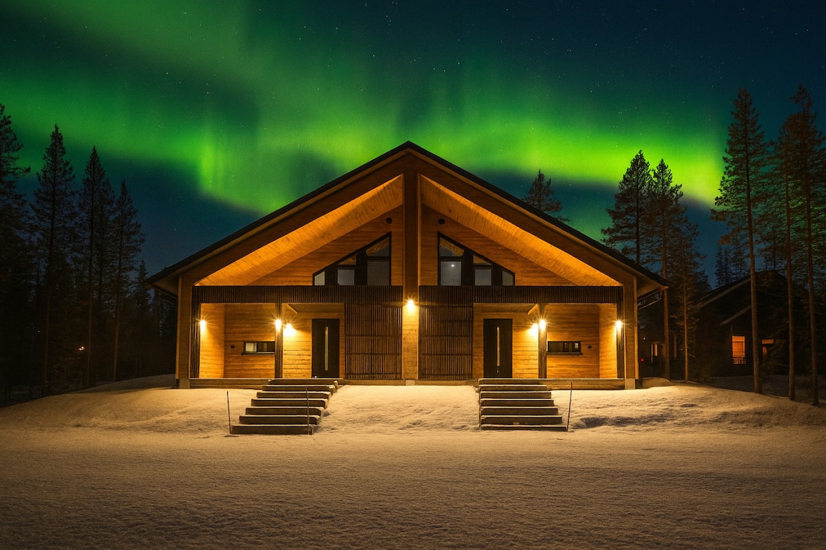この静かな宿泊施設でリラックスしましょう。ここでは、Torne elkの隣に新しく建てられた高級のログハウスに住んでいます。住宅は2階建てで、キッチン、大きなバスルーム、大きなリビングルーム、2ベッドルーム、スマートテレビ、靴乾燥機、下階と上階の両方の大きなパティオ、川沿いのパティオで構成されています。オーロラ、スクーター、犬の斜面、冬のお風呂が混在するトルン川の素晴らしい景色が見えます。薪焼きサウナとバーベキューエリアを有料でご予約いただけます。アイスホテル、故郷の農場、教会、ドアの外のビジネス駐車場まで徒歩圏内。