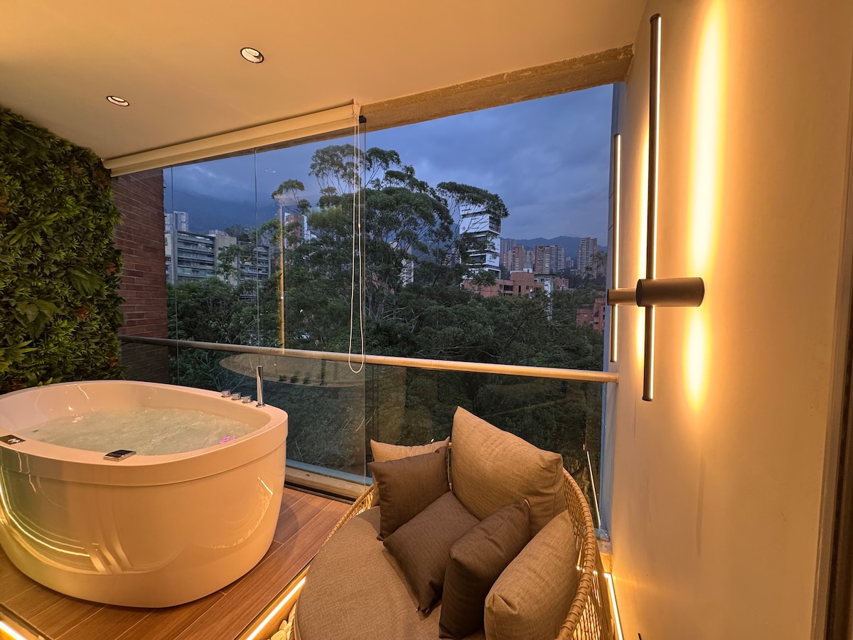 メデジンを満喫できる、プライベートなスカイラインジャグジー、キングサイズベッド、エアコン、息をのむような街の景色を備えたこの特別なスタジオは、エレガントで快適、そして活気に満ちたナイトライフを楽しめる究極の隠れ家です。エル・ポブラドに位置し、プロヴェンサのレストラン、屋上バー、カフェ、ギャラリーから数歩、パルケ・レラスのナイトライフから数分です。Netflixが見られる54インチのスマートテレビ、高速Wi-Fi、仕事用スペース、キッチン、洗濯機・乾燥機、ジム、サウナ、プール、敷地内のバー、レストラン、ギャラリーをお楽しみください。