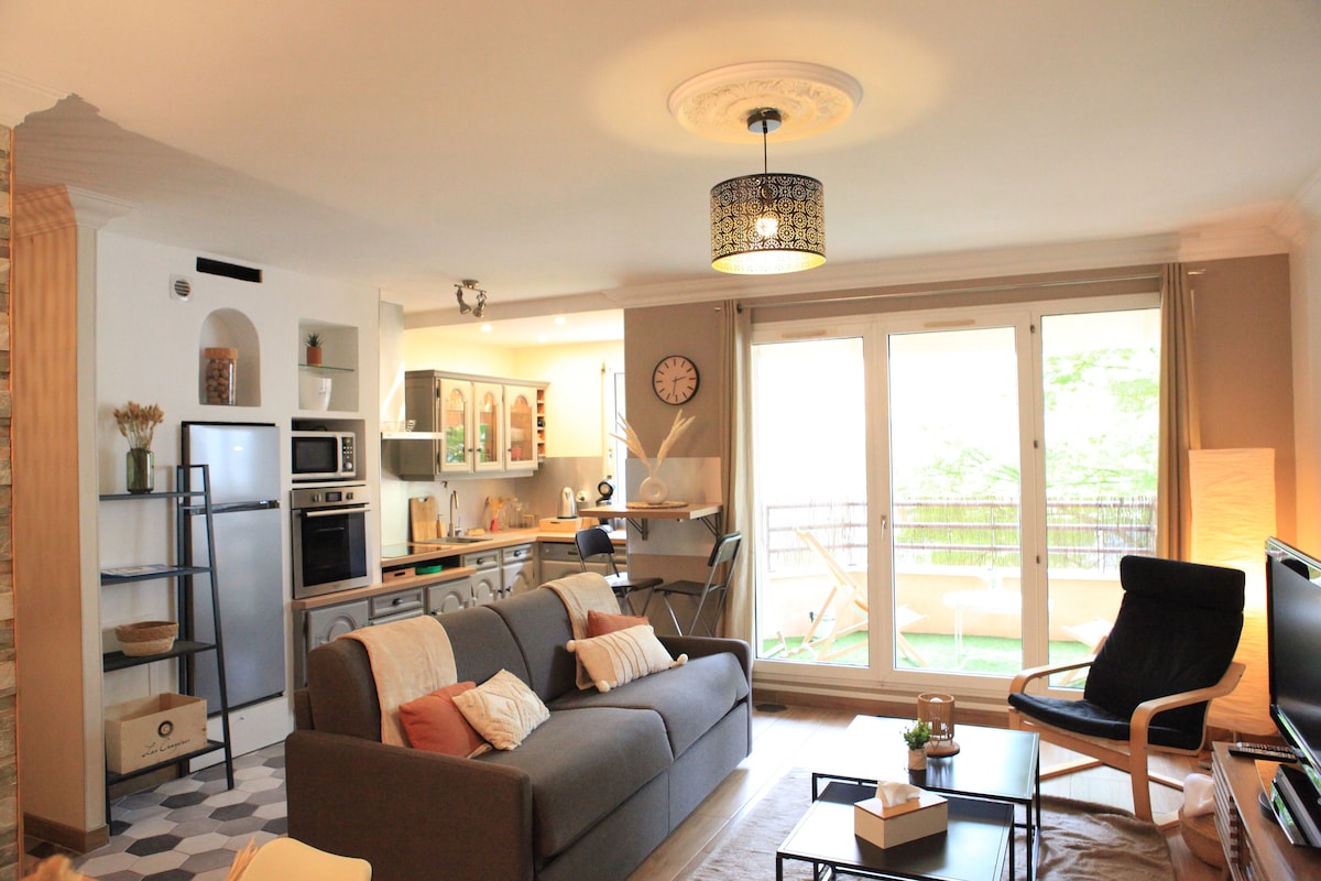 This charming F3 consists of 2 bedrooms. Sheets are provided and the bed will be made before your arrival. A very beautiful living space with equipped kitchen, Nespresso coffee machine, ceramic hotplates, oven, microwave. The bathroom consists of a shower, a vanity unit, a towel dryer, a washing machine. bath towels are provided. Also equipped with a live box 6 fiber optic connection. Perfect for business stays and exploring the city.