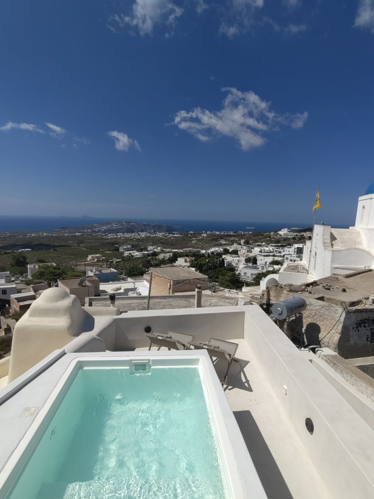 Martynou View Suite is a private property, located in Santorini Pyrgos village.Just a few steps away from restaurants cafe and more shops.Only 10 minutes driving distance from central Fira and the best beaches.This is an ideal choice for couples or small families.Suite offers private parking,a spacious living room with a kitchen, bathroom,double bed,air condition,coffee machine, 2 smart TV,fridge(offer bread jam honey butter),Wi-fi, and a private heated mini pool(jacuzzi)with stunning sea views!