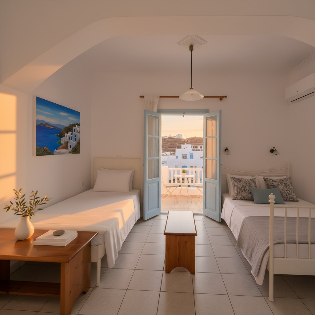 私たちのバンガローはミニマリストのキクラデス様式の建築で設計されており、専用バスルーム、無料駐車場、朝食が含まれています。自然の美しさを体験したい家族、カップル、または友人たちにとって、より快適でプライベートな理想的な選択肢です。ダブルベッド1台とシングルベッド1台またはシングルベッド3台の客室を選択できます。