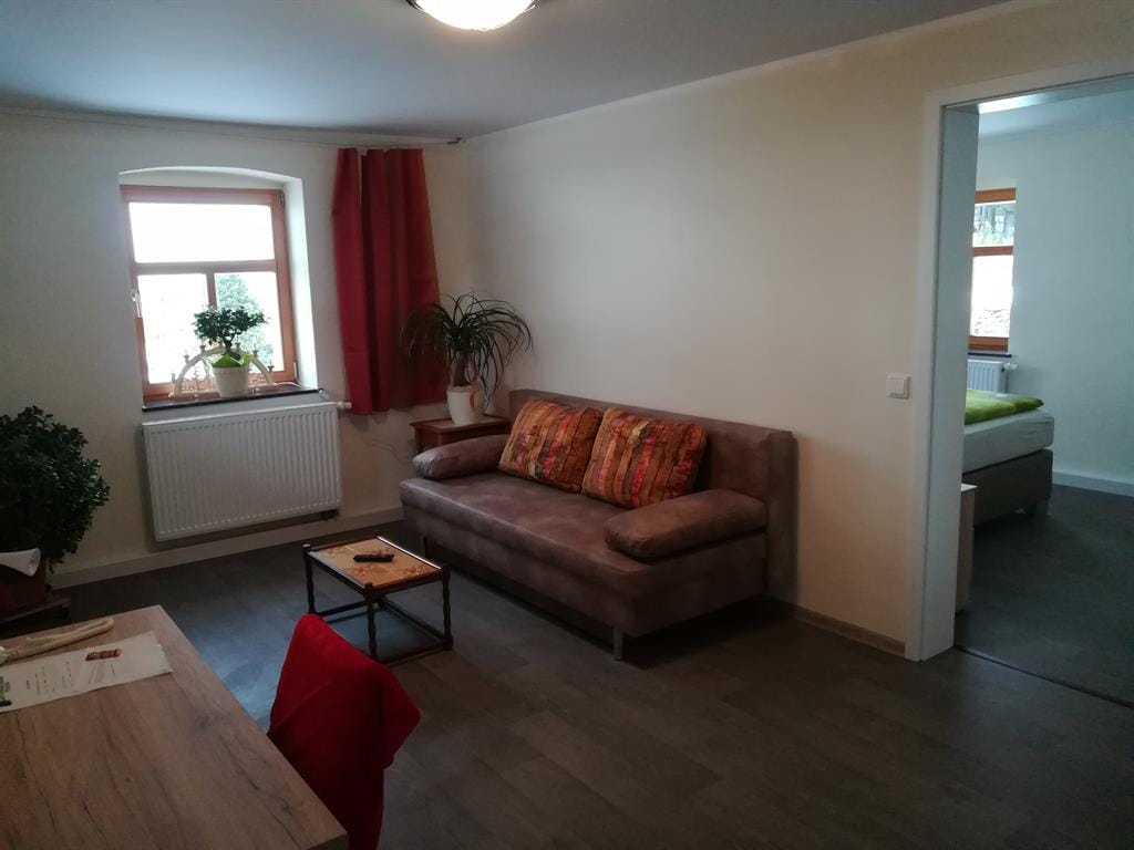 Our apartment "Pöhlberg" has a size of 58sqm and is located on the ground floor of our country house: - Occupancy of 1-4 people, 1 separate bedroom with box spring double bed, spacious living room with 2 optional sofa beds 1.65mx 2.00m with topper, dining area for up to 4 people, separate kitchen fully equipped with fridge, ceramic hob with oven, coffee machine , Toaster, kettle, bathroom with shower and toilet, cosmetic mirror and hairdryer. - Baby bed and high chair available - Dog after registration 8, - Euro per day - Bed linen and towels free of charge, change as needed for longer stays