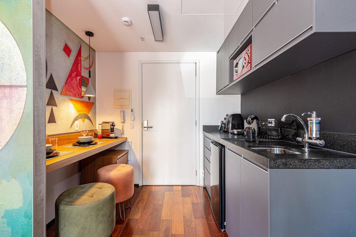 Boutique studio in the heart of Perdizes, featuring a design project. Custom carpentry, signature leather bed, 500-thread count linens, sisal rug, blackout curtains, AC. Curated tableware by Casa Delas — all available for purchase. Two handcrafted pieces from the Northeast add soul to the space. Climate-controlled wine fridge with bottles for sale, cozy dining nook, illuminated glass cabinet and a boutique hotel atmosphere. For stays of 7 nights or more we offer a breakfast on the first day.