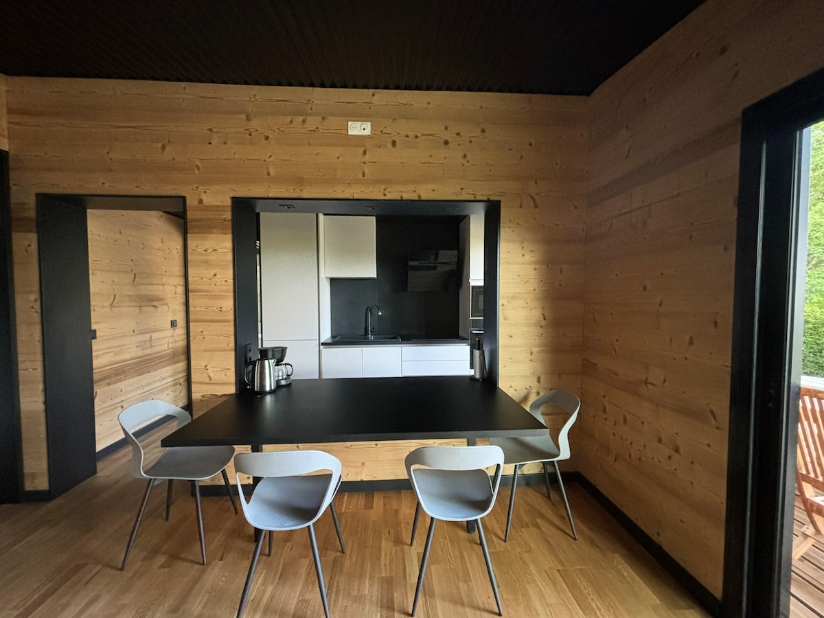 このログハウスは、モダンな快適さと自然の中でのんびり過ごすことの絶妙なバランスが取れています。 160x200 cmのクイーンサイズベッドが備わっています。 森と池の景色を望む、自然光が差し込む空間。 小型冷蔵庫、コンビオーブン、シャワー付きのバスルーム、独立したトイレがこの丸太小屋を完成させています。 リラックスするために、テラスにある半埋め込み式の北欧風のバスタブに滑り込むことができます。