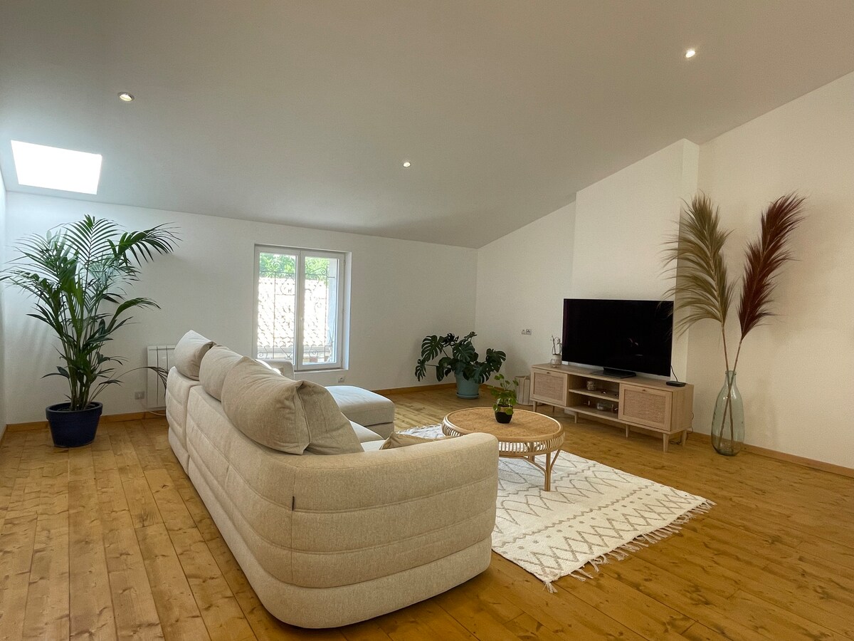 快適で清潔なエアコン付きのお部屋(21平方メートル)で、暖かく、静かで、プライバシーが確保された独立した玄関があります。ウェルカムコーヒー、エスプレッソ、紅茶、ミネラルウォーター、マドレーヌ、牛乳、バター、クロワッサン、ジャム、電子レンジ、レンタル自転車をご用意しております。 LES GRANDS BUFFETS、シジャン動物園、市内中心部、ビーチに近い立地。 10メートル先に無料駐車場(オートバイ用ガレージ)があります。 近くには市内中心部行きのB系統バスが通っています。 スタジオには32インチのテレビが備えられています。