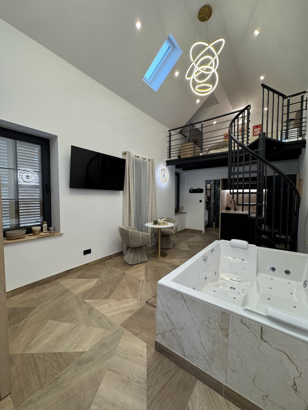Appartement d’exception de 40 m² avec mezzanine, offrant de grands volumes. Profitez d’un espace bien-être privé avec jacuzzi haut de gamme sur mesure (jets d’eau et d’air) et sauna infrarouge avec chromothérapie. Climatisation réversible, 2 TV connectées, éclairage personnalisable. Cuisine équipée (Tassimo, four micro-ondes…). Salle de bain avec douche pluie GROHE. À 5 min à pied du centre de Dijon.