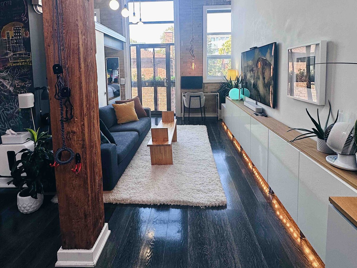 広々とした1ベッドルームのロフト•高い天井•どこへでも歩いて行ける