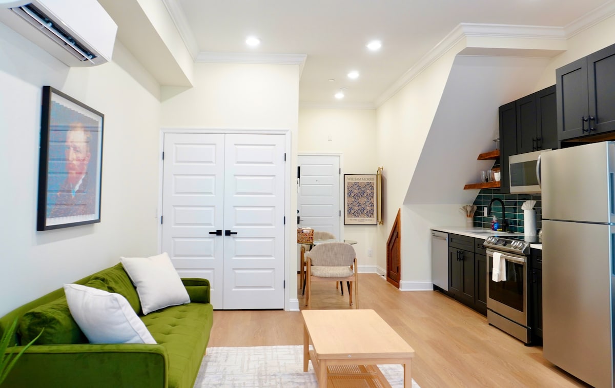 美術館エリアの美しいワンルーム - この広々としたオープンフロアのアパートには、高い天井、堅木の床、フルサイズのマーフィーベッド、布団、60インチの回転式マウントテレビ、Wi-Fi、専用バスルーム、洗濯機・乾燥機、オーブン・電子レンジが備わっています。美術館、レストラン、公園など、たくさんの素晴らしいアトラクションからわずか数ブロックです!この2戸建ての建物では、非対面でのチェックインと、お部屋のプライバシーが確保されています。メトロポリタン美術館、ブロードストリート地下鉄、地元のレストランが徒歩圏内にあります。