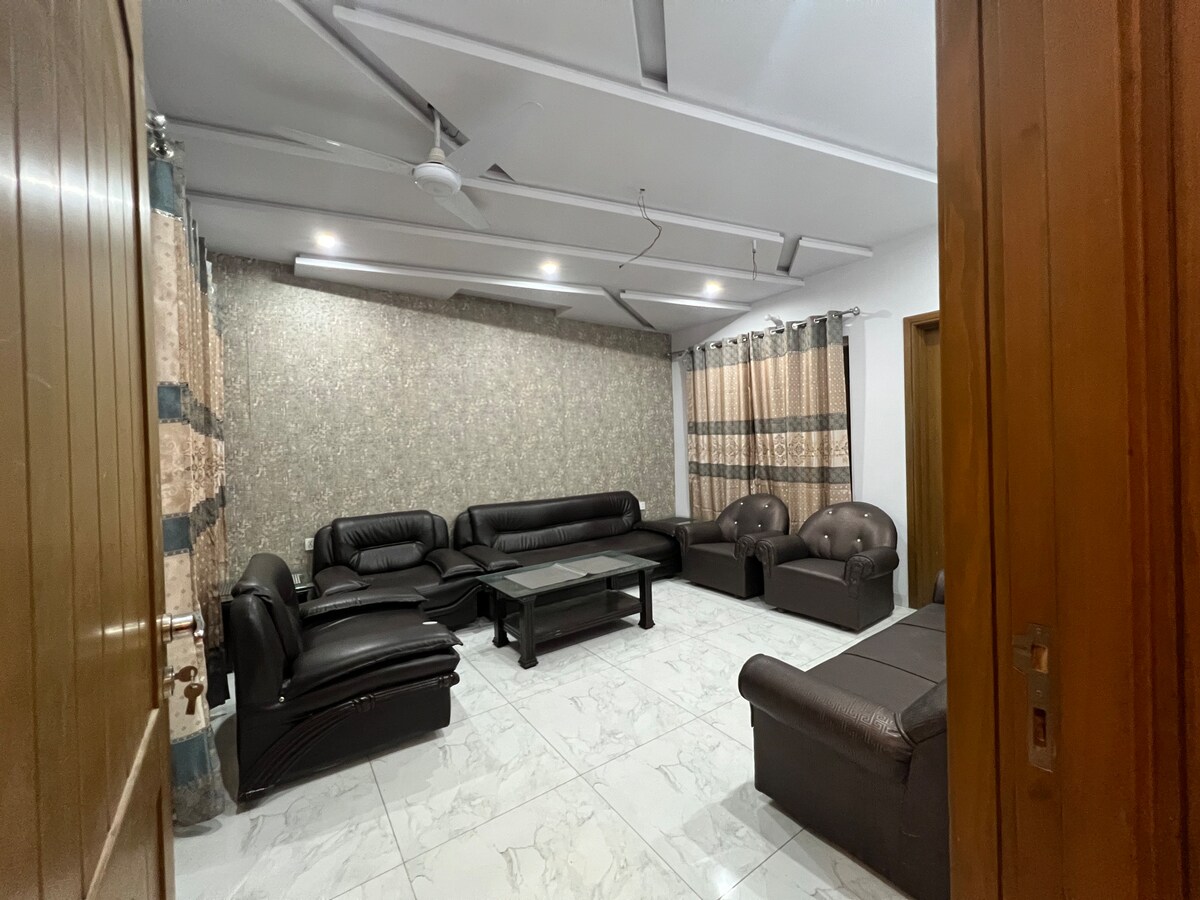 This luxury, fully furnished private ground-floor home is located in the peaceful and secure area of Kohinoor Town, Faisalabad, offering complete privacy with an independent entrance. The space includes 1 spacious bedrooms with attached bathrooms, a large TV lounge, and a separate dining area. sterilized linens, and 24 hours room service,heated and air-conditioned, with high-speed Wi-Fi, power backup, laundry service, and free car parking for up to 4 vehicles. Ideal for daily and monthly stays.