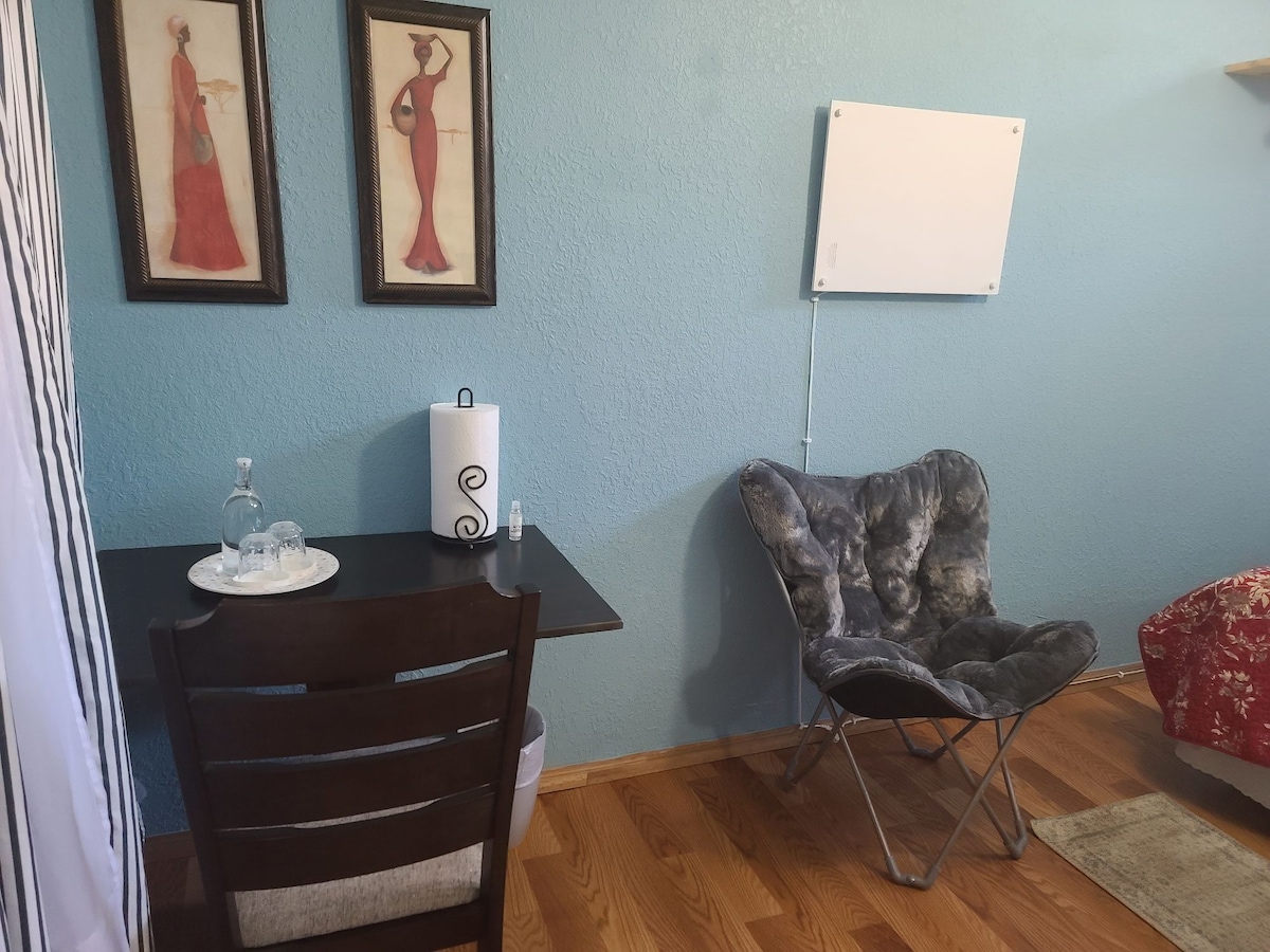 Our guests enjoy privacy of our bunkhouse. Living rm/shower/toilet and lav are downstairs. One twin bed and a futon in 'standing room' loft. Queen bed in private bedroom. WIFY and Roku/Hulu. Breakfast fixings: coffee, tea, cereal bars, instant oatmeal, waffle/muffin mix. Microwave, toaster oven, ele. hot plate for cooking. Dorm size refrig/freezer. Several great local restaurants. 4 museums. Pet friendly! $10 for each additional adult, after 2. Approx 6 miles from Cuero and 25 from Victoria.