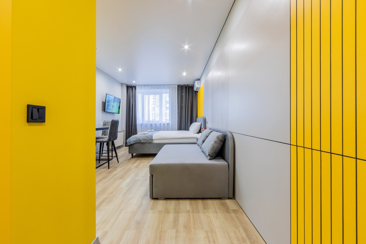 Сучасні апартаменти-студії з новим дизайнерським ремонтом у стильних сіро-жовтих тонах створюють атмосферу затишку та комфорту. У студії є велике ліжко з ортопедичним матрацом, кондиціонер, телевізор, швидкісний Wi-Fi, повністю укомплектована кухня та сучасна душова кімната. Ідеальний варіант для комфортного відпочинку після насиченого дня — як для подорожей, так і для тривалого проживання.