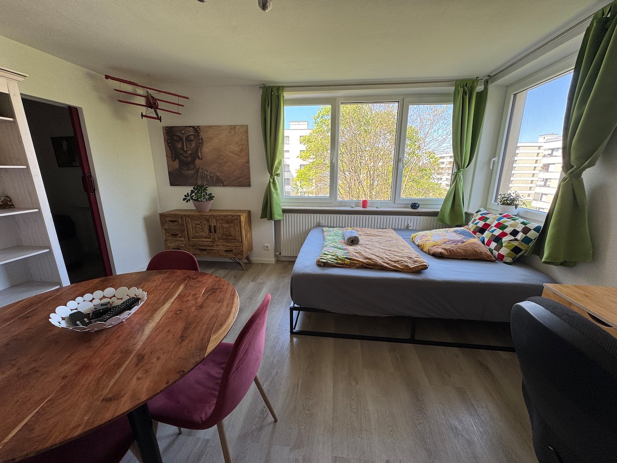ようこそ!私たちは、私たちのアパートから離れた、独立した入り口のある約30平方メートルのアパートを貸しています。ミュンヘンの見本市、リーム・アーケードに近く、ブーガ公園のそばに静かに位置しています。地下鉄で15分でミュンヘンの中心部に行けます。 アパートメント: - 寝室(約11.3平方メートル)、ダブルベッド(1.60×200cm)、43インチのフィリップス製テレビ。 - バスルーム(約6.5平方メートル)バスタブ付き。 - 座席付きキッチン(約5.9平方メートル)。 - 廊下(6.5平方メートル)。 ***地下駐車場1台分込み、特に見本市の時期には便利です***